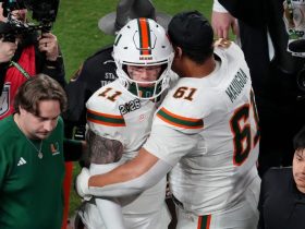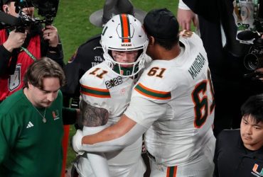 MIAMI GARDENS, FL – All Carson Beck could do was raise both hands and ...